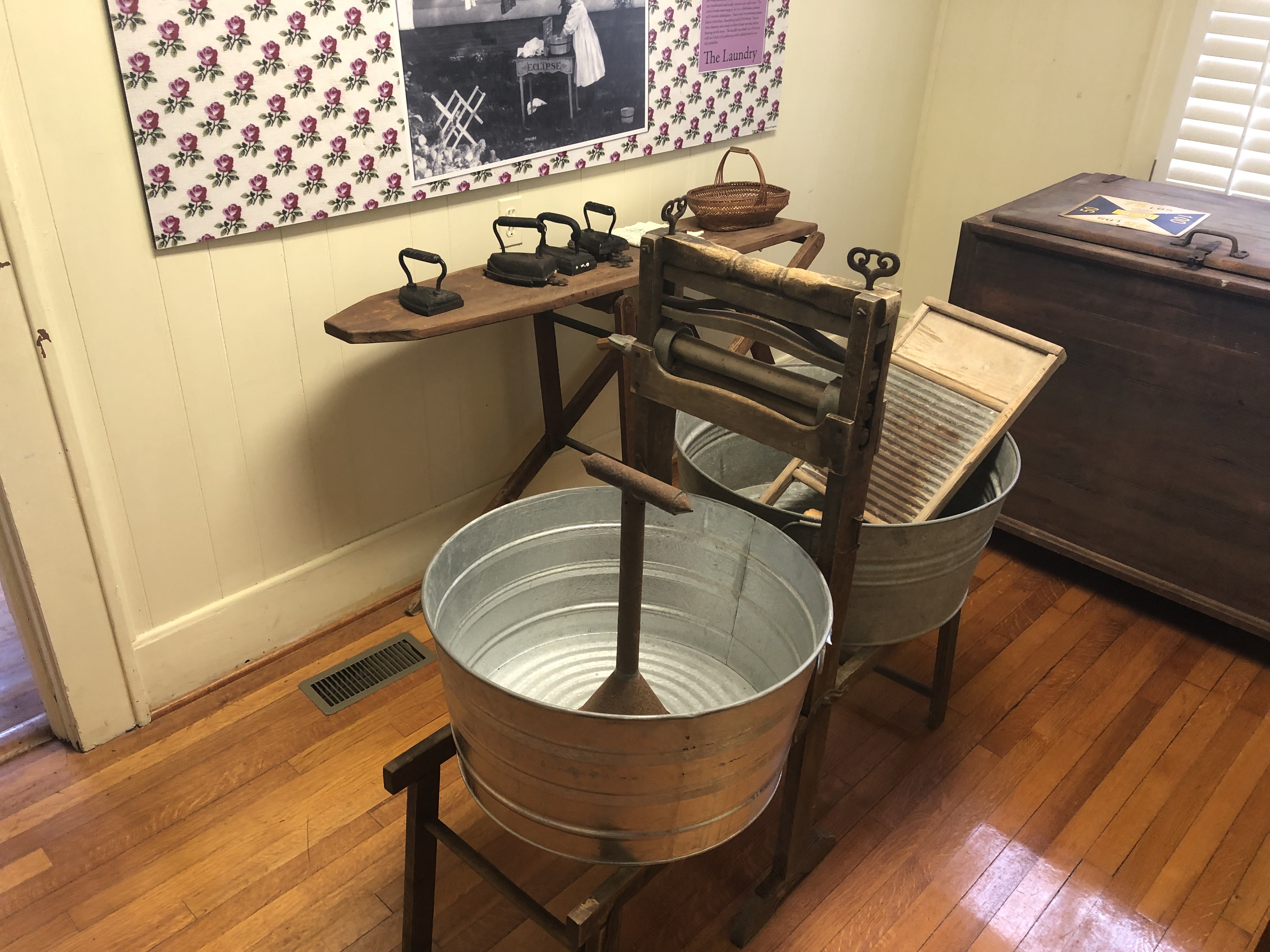 The process usually began and finished out in the yard with heating water in a wash pot and then hanging the clothes to dry on the clothes line. Shown in this exhibit are the washtubs, a ringer to squeeze out the water, and a washboard to scrub the clothes on to help remove dirt and other stains. The irons were heated on the stove or in front of an open fireplace. A family would have several so they could be rotated between heating and ironing the clothes.