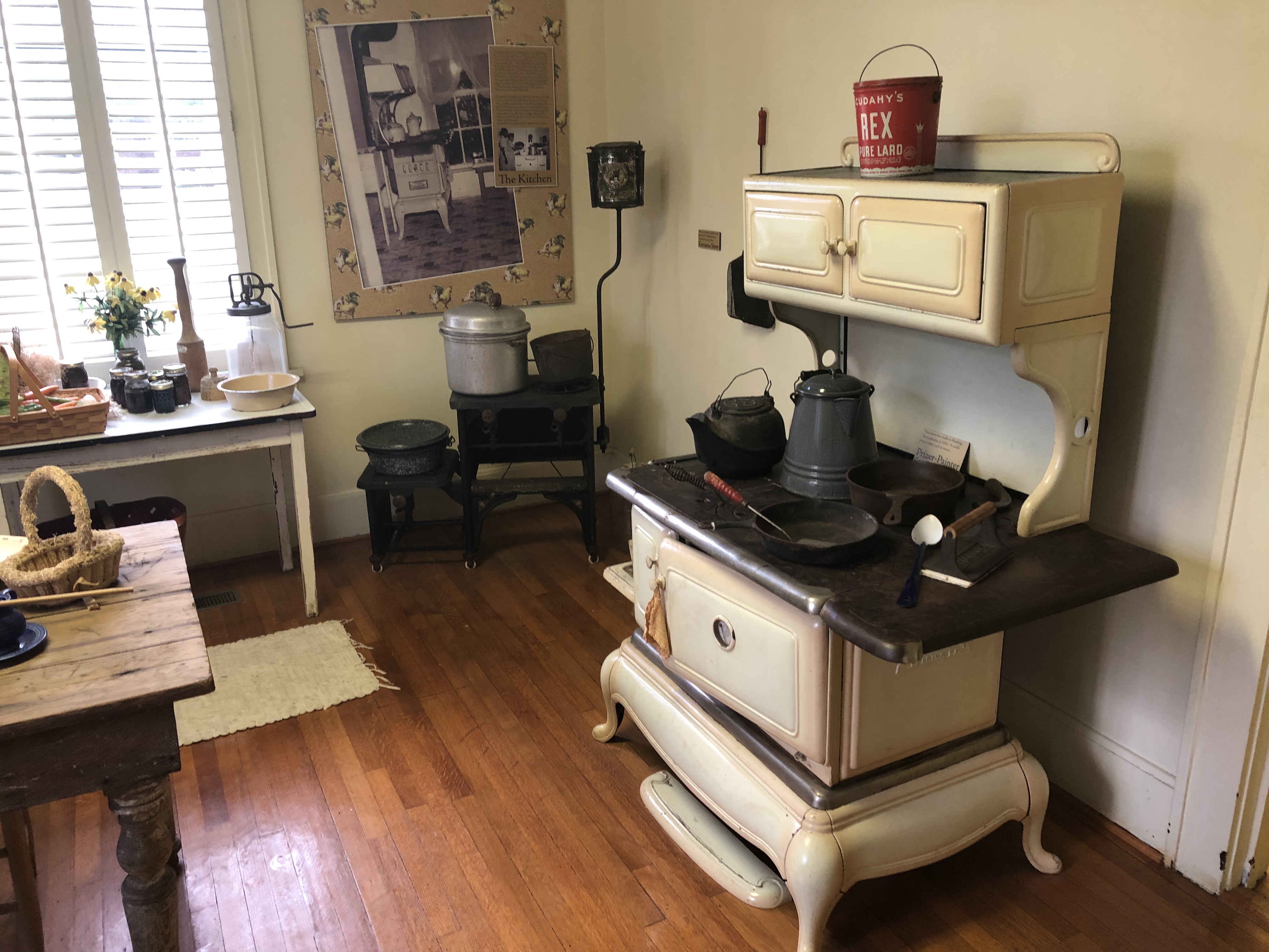 The typical kitchen had a wood burning cook stove as shown here. Sometime there was a small heater, shown here in the corner, for heating water, especially for bathing, |