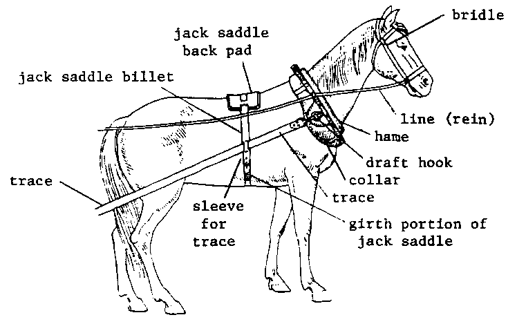 mule with ropes--the reins--attached to the bridle on the mule's head.